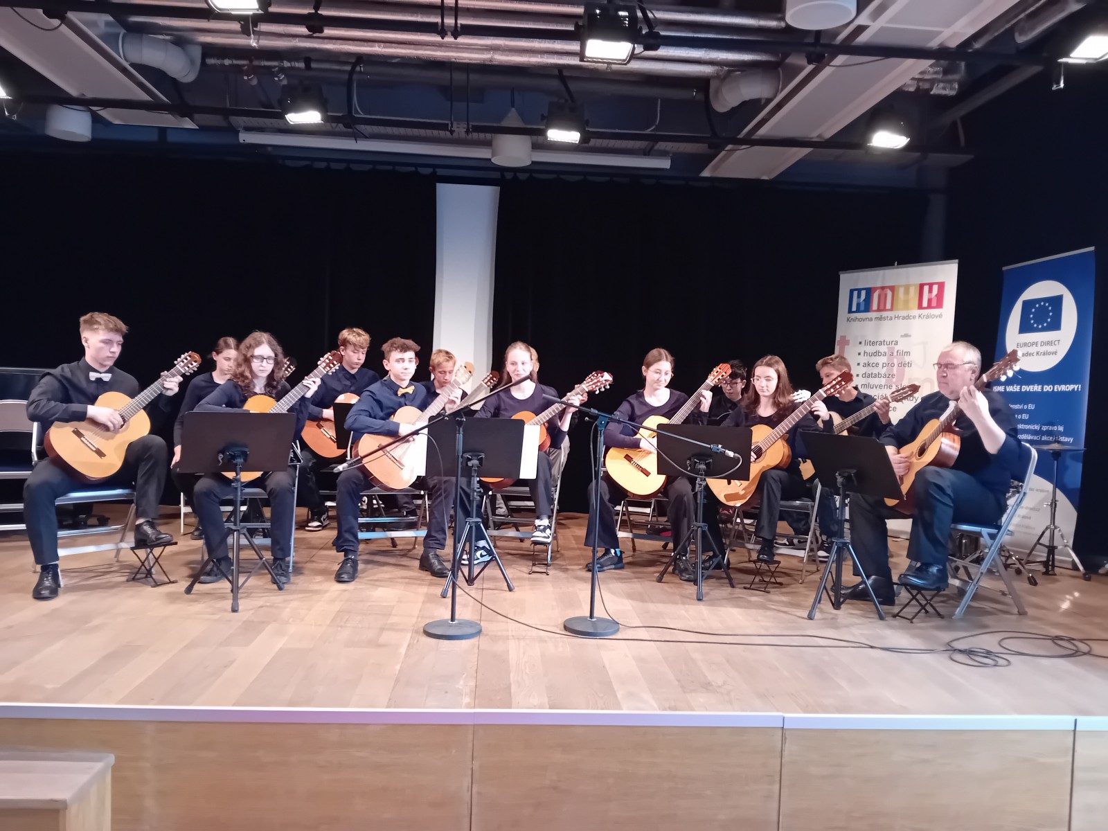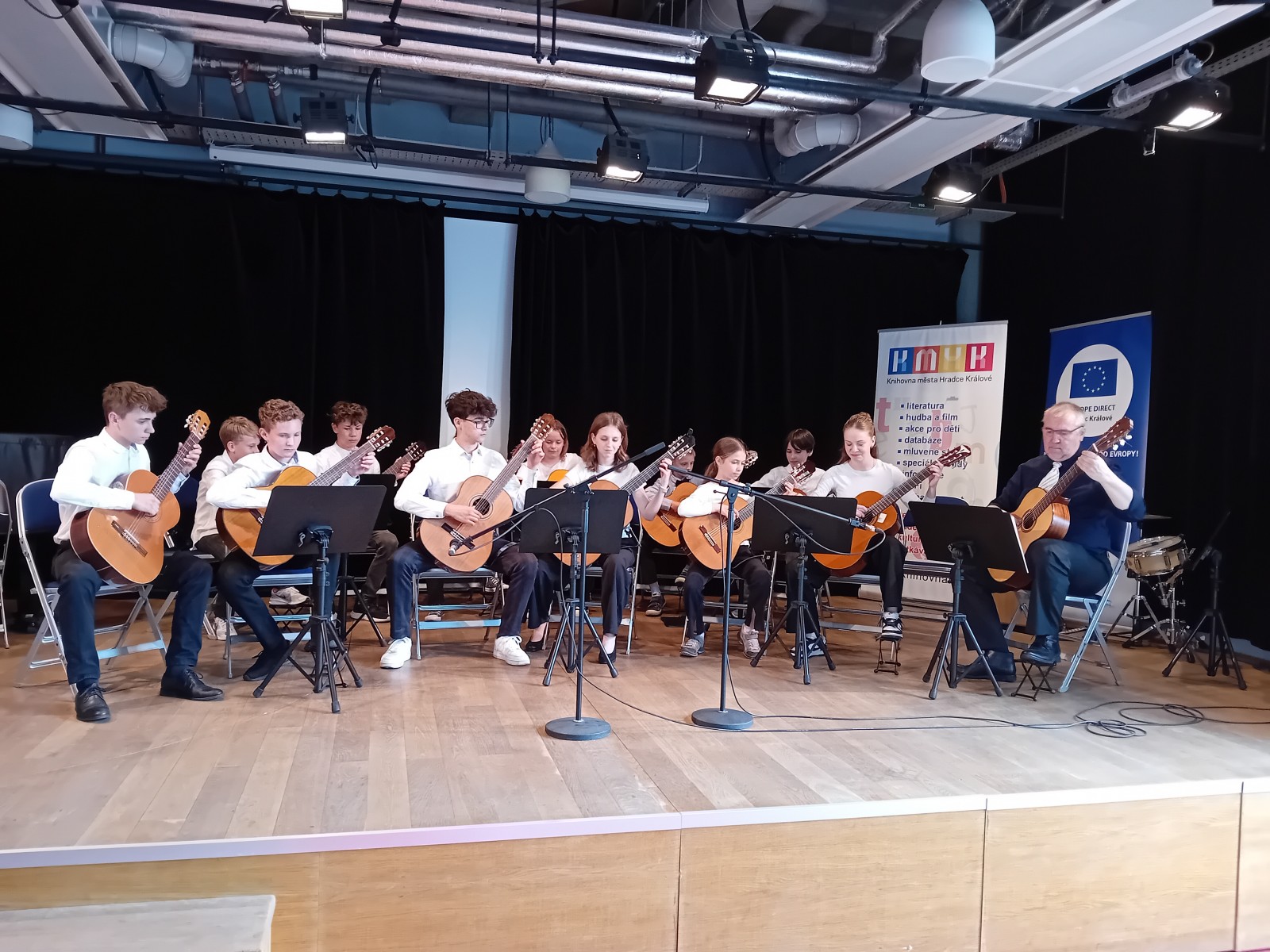 Ve čtvrtek 6. června vystoupili naši žáci na Koncertu kytarového oddělení v Knihovně města Hradce Králové ve Wonkově ulici. Sál knihovny byl zcela zaplněn vděčným publikem. Na koncertu zazněla hudba z období renesance, baroka a také tvorba soudobá. Návštěvníkům se obzvláště líbily kytarové orchestry. Ocenili zejména jazzové kusy, které jim v závěru předvedl Kytarový orchestr složený z našich nejzkušenějších kytaristů.