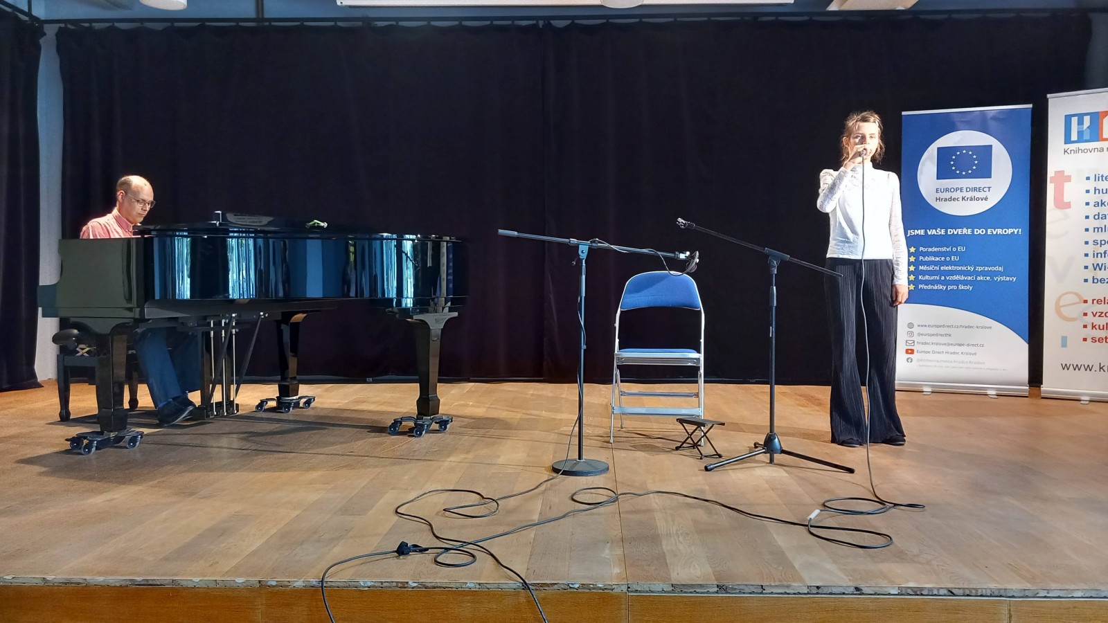 Školní rok je teprve za dveřmi, ale pěvecké oddělení je již v plné pohotovosti: slečna Emma Wertzová (ze třídy H. Matyášové) vystoupila 28. srpna v Knihovně města Hradce Králové na slavnostním Setkání jubilantů a během dvou odpoledních programů přednesla vlastní aranže francouzských šansonů.