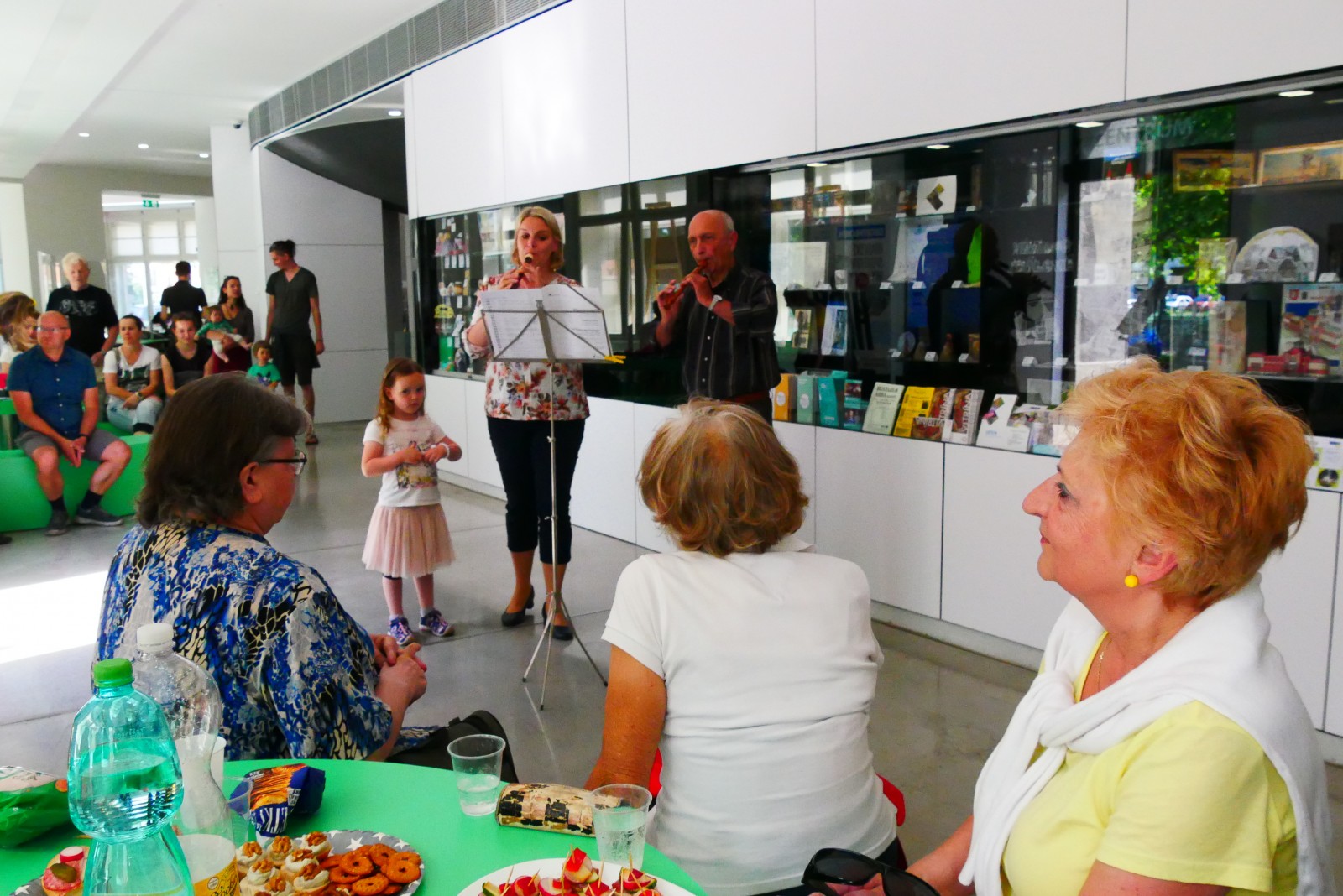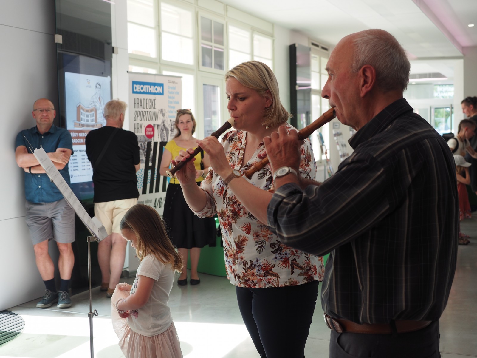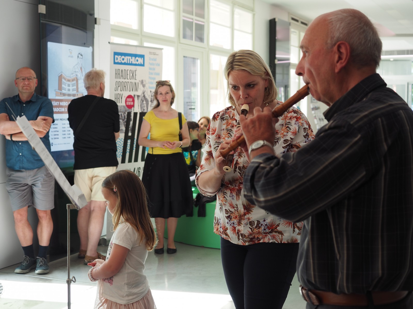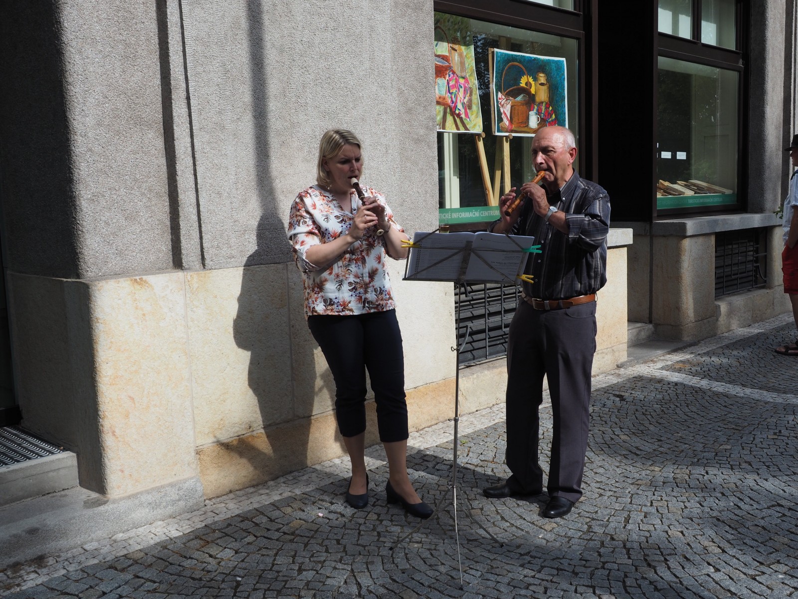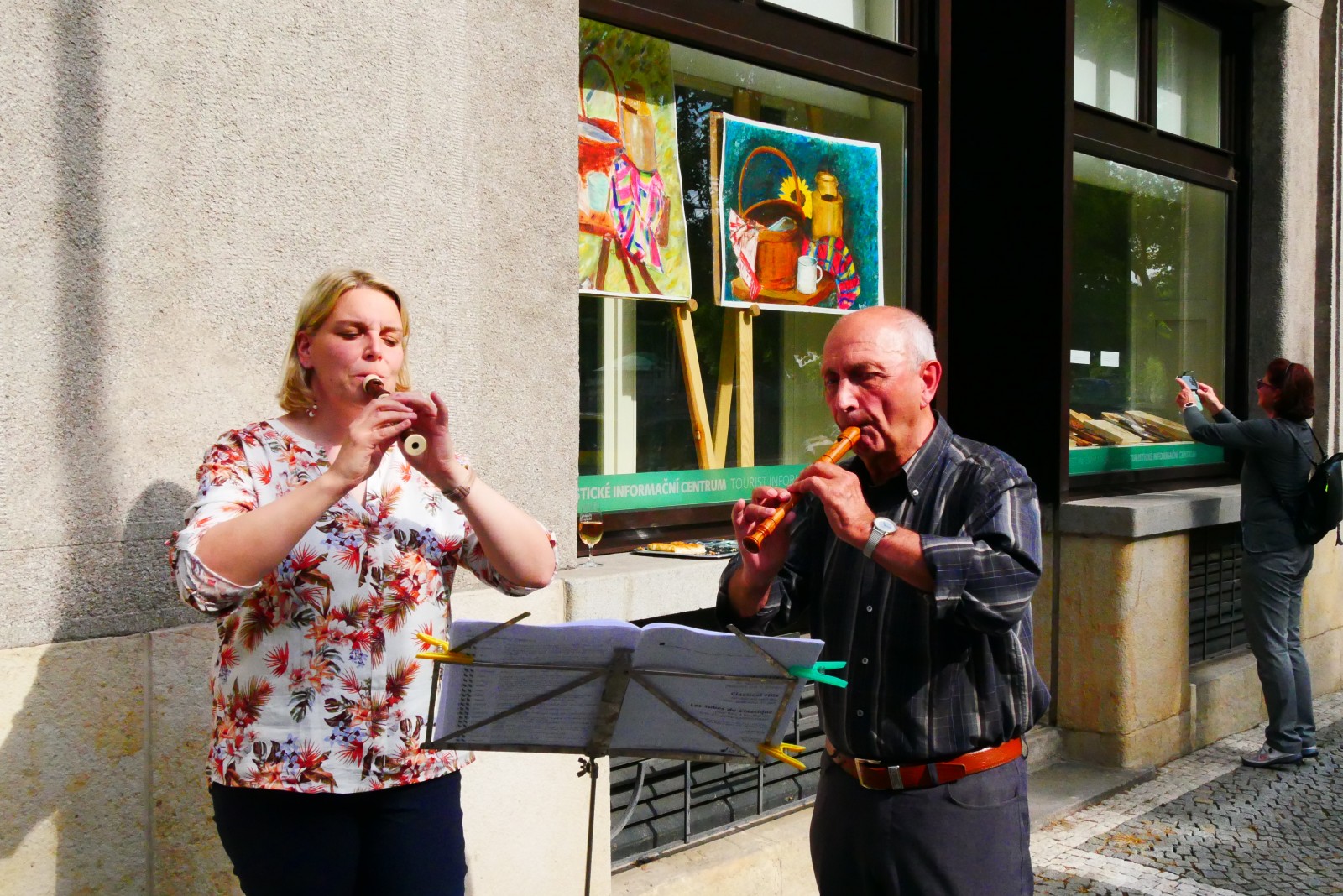 Vernisáž zahájilo flétnové duo student-učitel, pan Josef Hartvich a paní učitelka Michaela Pitrová. Posléze se vernisáž přesunula z útrob infocentra na nábřeží, kde se úspěšný závěr studia náležitě oslavoval, a to i za tónů hudby v provedení již zmíněného flétnového dua.