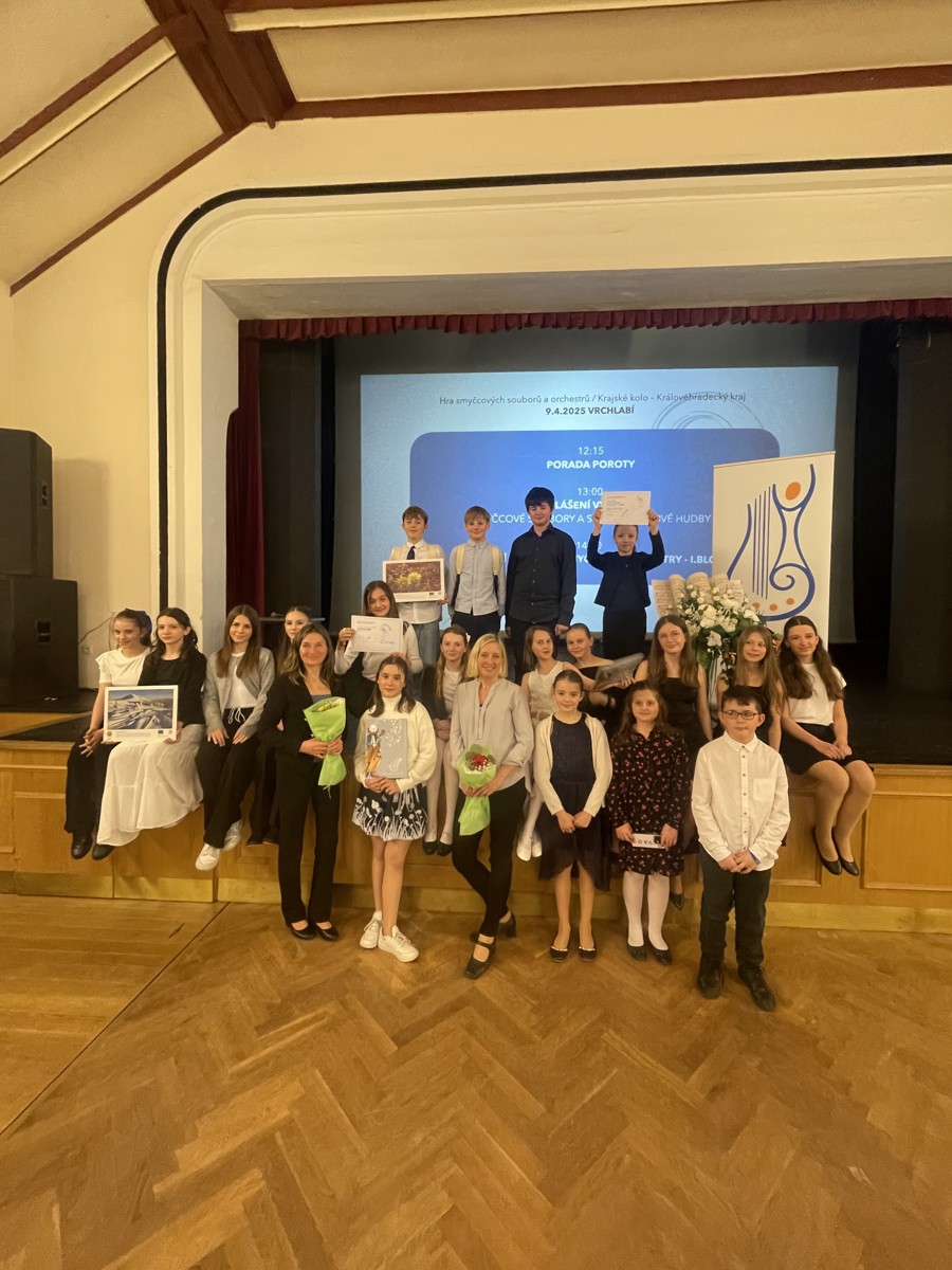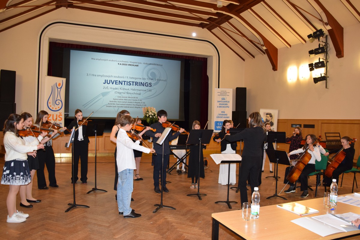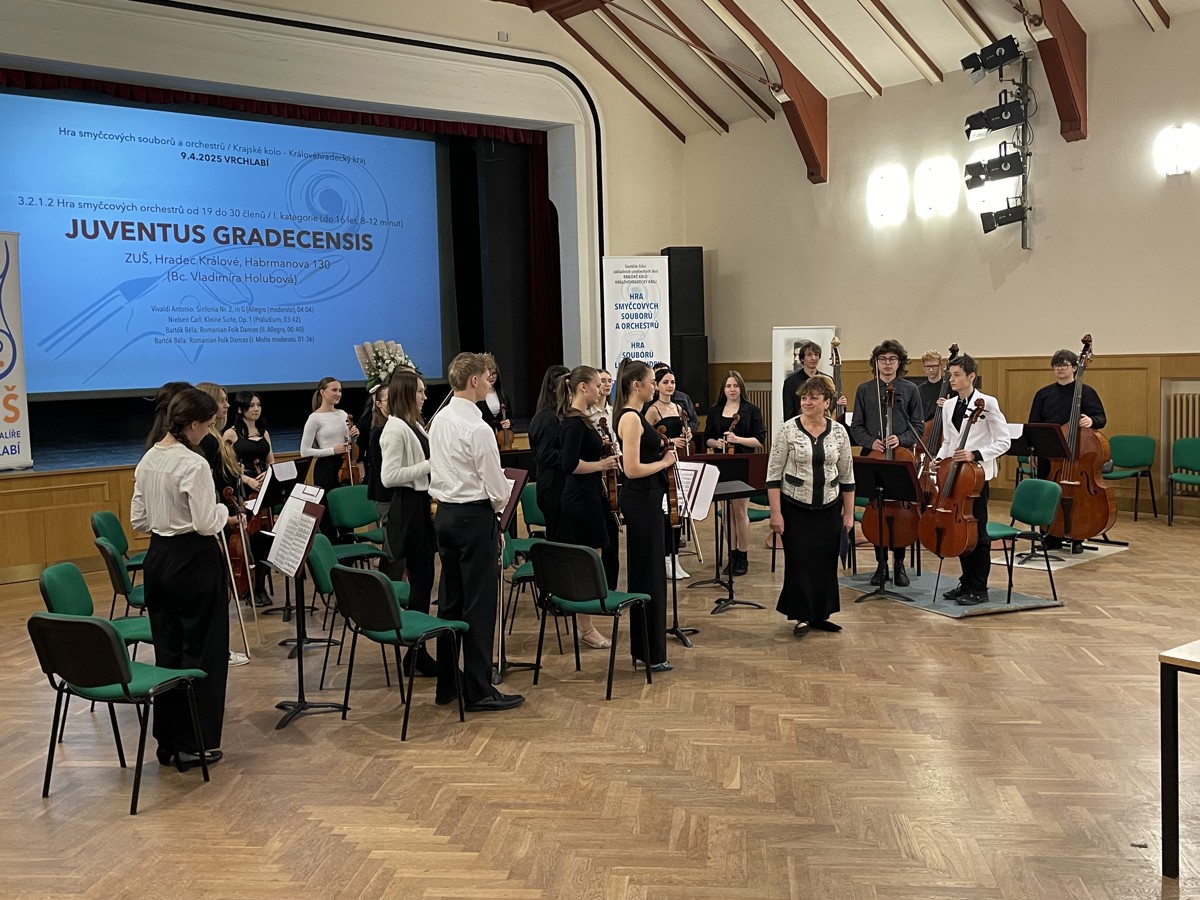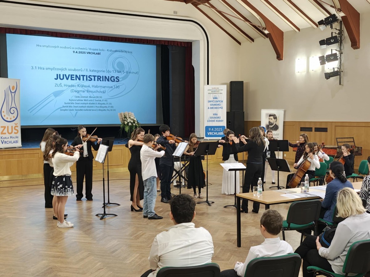 Ve středu 9. dubna 2025 se ve Vrchlabí uskutečnila krajská soutěž smyčcových orchestrů, která letos zaznamenala mimořádně vysokou účast. Na pódiu se představilo celkem 12 souborů a orchestrů z celého kraje. V této silné konkurenci se mladší orchestr Juventistrings pod vedením Dagmar Besuchové neztratil – naopak! Získal 1. místo ve své kategorii a navíc i titul Absolutního vítěze dopoledního soutěžního bloku.