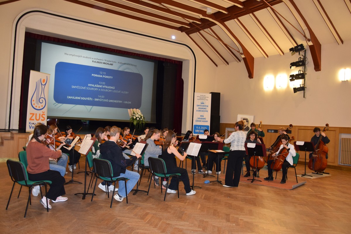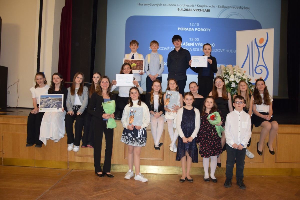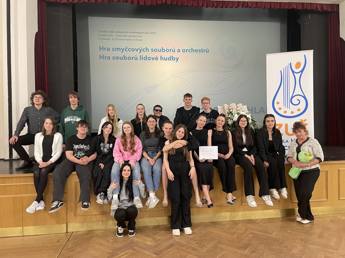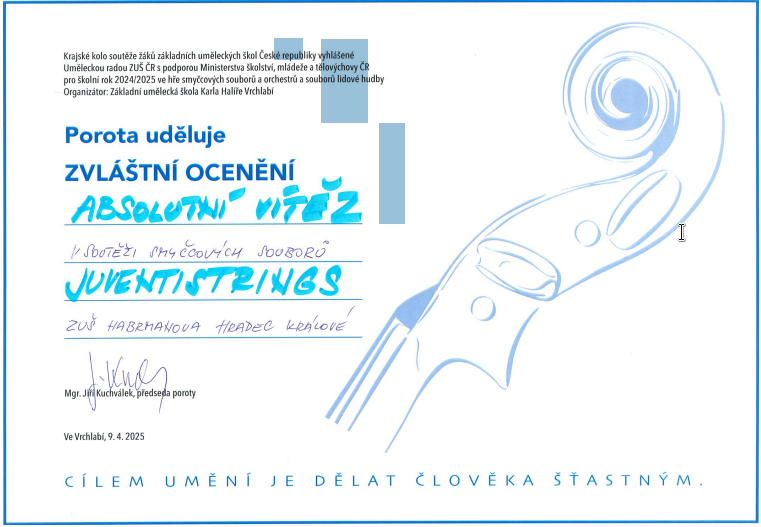Ve středu 9. dubna 2025 se ve Vrchlabí uskutečnila krajská soutěž smyčcových orchestrů, která letos zaznamenala mimořádně vysokou účast. Na pódiu se představilo celkem 12 souborů a orchestrů z celého kraje. V této silné konkurenci se mladší orchestr Juventistrings pod vedením Dagmar Besuchové neztratil – naopak! Získal 1. místo ve své kategorii a navíc i titul Absolutního vítěze dopoledního soutěžního bloku.