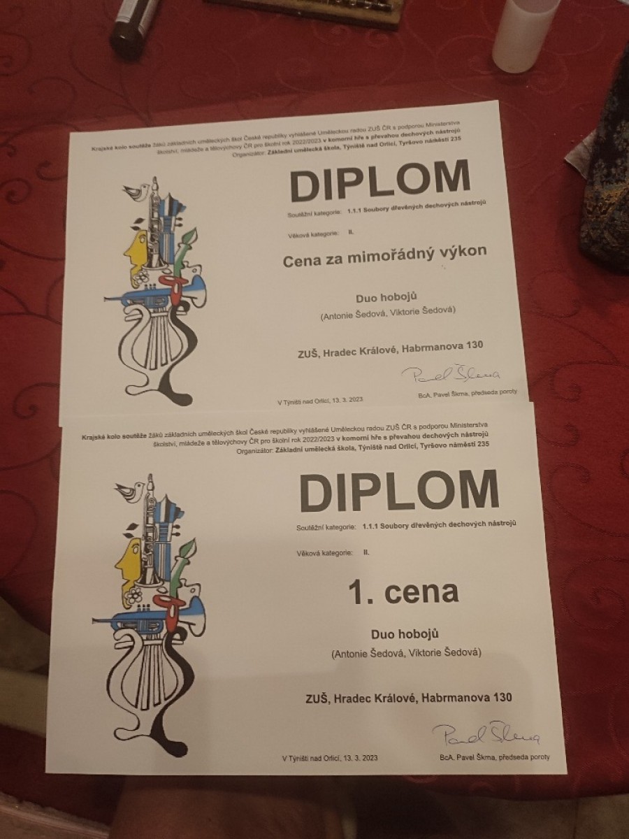 V krajské soutěži souborové hry dechových dřevěných nástrojů konané dne 13. 3. 2023 v ZUŠ v Týništi nad Orlicí získalo Duo hobojů ve složení Antonie Šedová a Viktorie Šedová ze třídy Evy Hainové to nejvyšší ocenění, tedy I. cenu, která jim zajistila postup do nejvyššího, ústředního kola. Zároveň byla duu udělena i Cena za mimořádný výkon.